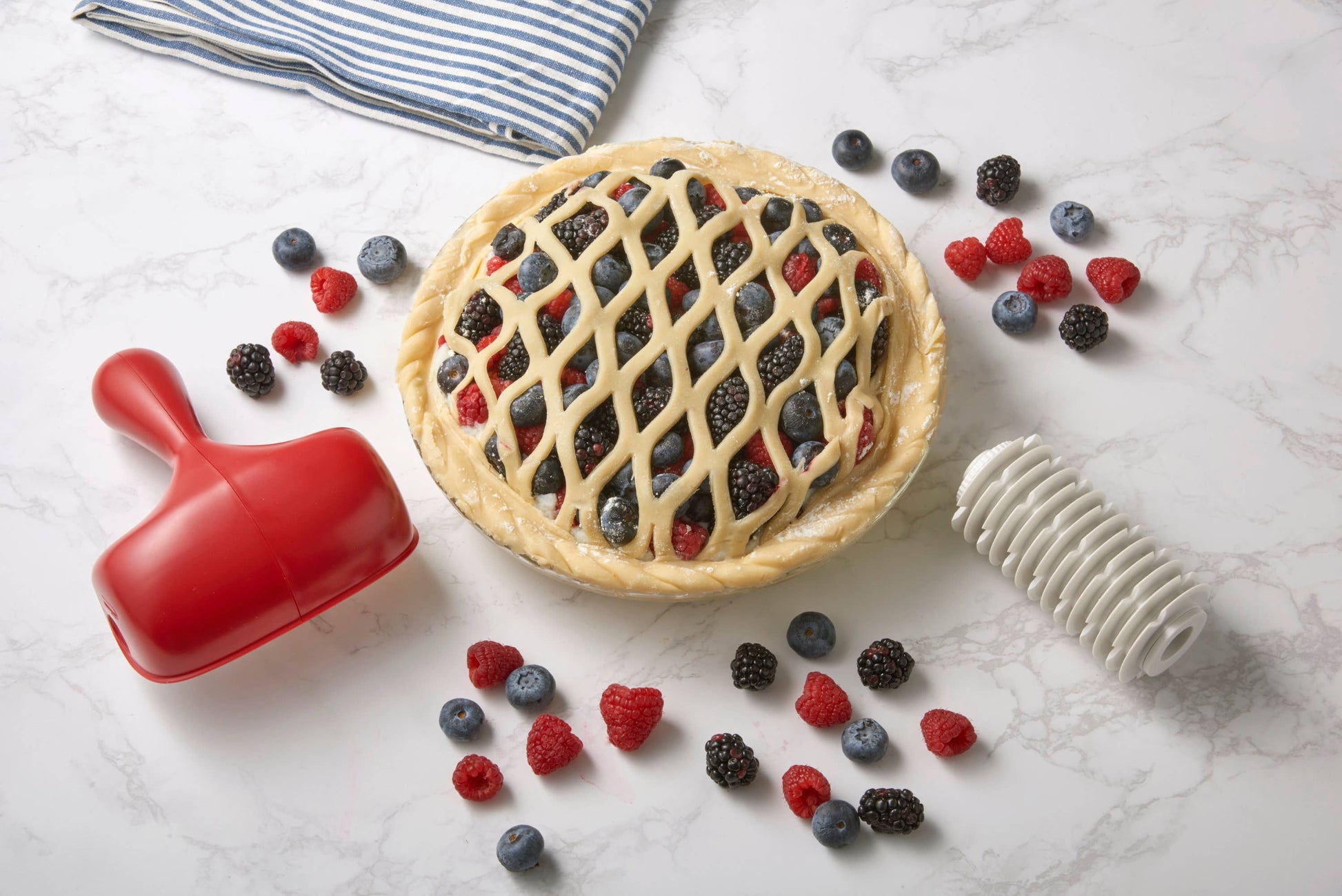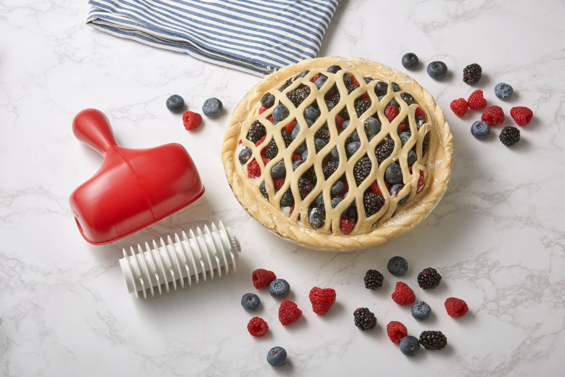 The Pastry Dough Cutter allows you to decorate your pies in no time. With two interchangeable cutters, you can choose from cutting uniform strips or creating a beautiful netting pattern.